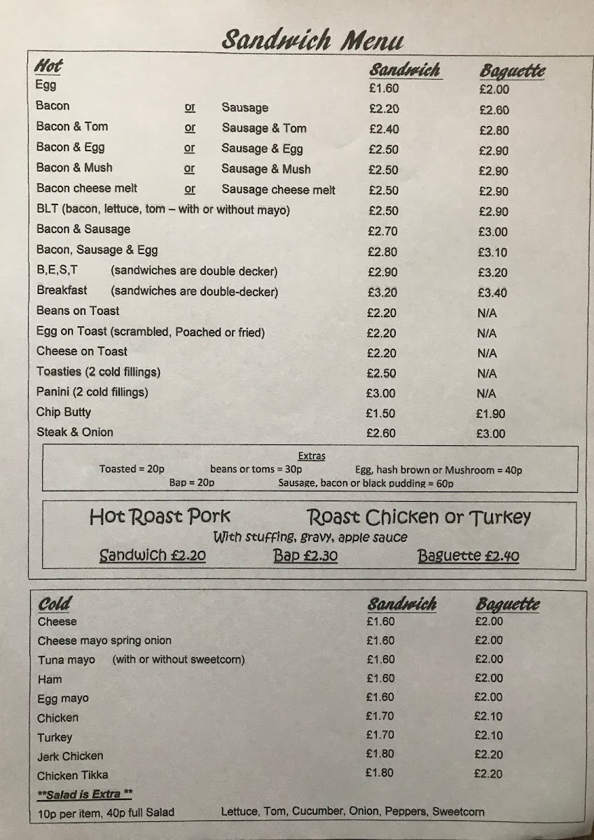 Hot Items: Classic breakfast and hot sandwich options such as Egg, Bacon combinations (with tomato, mushroom, cheese, or sausage), BLT, various Toasties, Panini, Chip Butty, and Steak & Onion sandwiches.