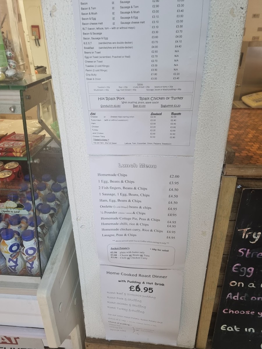 Main Meals and Classics: This includes traditional dishes like Roast Beef with Yorkshire Pudding, Roast Chicken with Stuffing, Chilli, and various bakery items including Apple Pie and Sponge Cake.